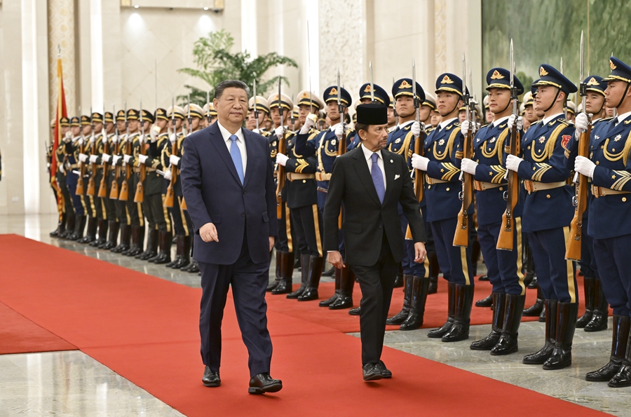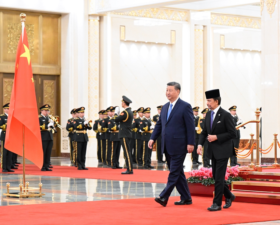 2月6日上午,国家主席习近平在北京人民大会堂同来华进行国事访问的文莱苏丹哈桑纳尔举行会谈。这是会谈前,习近平在人民大会堂北大厅为哈桑纳尔举行欢迎仪式。新华社记者 申宏 摄
