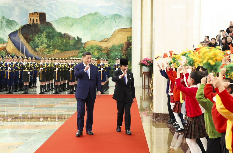 2月6日上午,国家主席习近平在北京人民大会堂同来华进行国事访问的文莱苏丹哈桑纳尔举行会谈。这是会谈前,习近平在人民大会堂北大厅为哈桑纳尔举行欢迎仪式。新华社记者 李响 摄