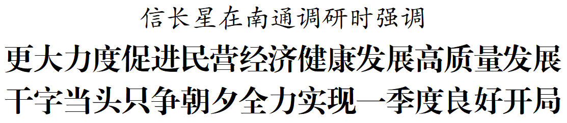 2月20日至21日,省委书记信长星到南通调研。他强调,要深入学习贯彻习近平总书记在民营企业座谈会上的重要讲话和对江苏工作重要讲话精神,更大力度促进民营经济健康发展、高质量发展,干字当头、只争朝夕抓好各项工作,全力实现一季度良好开局。