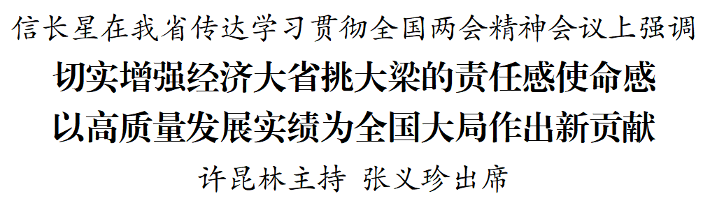 信长星强调,要以学习贯彻习近平总书记重要讲话和全国两会精神为强大动力,紧抓当前、抓好当前。认真贯彻党中央决策部署,强化政策衔接配套,加强经济运行监测分析调度,及时发现和解决苗头性、趋势性问题,继续巩固和增强经济回升向好态势。坚持底线思维,以“时时放心不下”的责任感,切实防范化解各领域风险隐患。认真开展深入贯彻中央八项规定精神学习教育,聚焦主题,注重实效,一体推进学查改,确保学有质量、查有力度、改有成效,推动全省广大党员干部以更强担当、更优作风、更好形象落实好经济大省挑大梁责任。