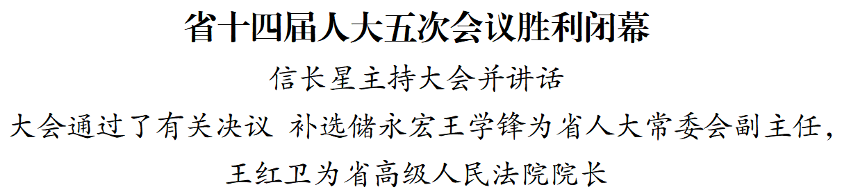 2月6日下午,江苏省第十四届人民代表大会第五次会议举行第三次全体会议,大会圆满完成各项议程后胜利闭幕。省委书记、省人大常委会主任信长星主持会议并讲话。