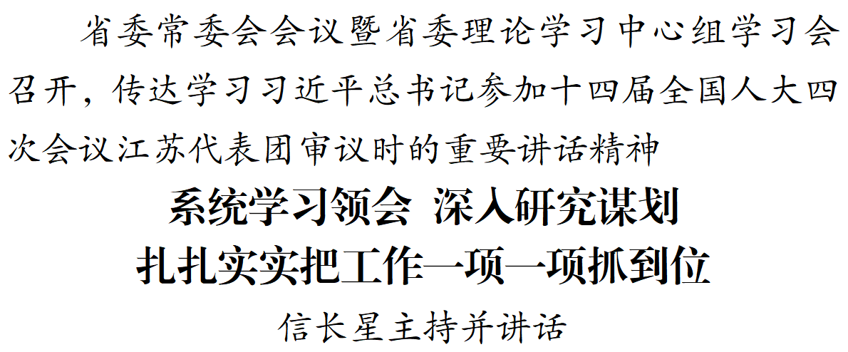 3月13日,省委常委会会议暨省委理论学习中心组学习会召开,传达学习习近平总书记参加十四届全国人大四次会议江苏代表团审议时的重要讲话和近期发表的重要文章精神,研究贯彻落实举措。省委书记信长星主持会议并讲话。