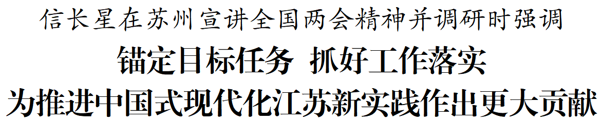 3月16日至17日,省委书记信长星到苏州宣讲全国两会精神并调研。他强调,要深入学习贯彻习近平总书记参加十四届全国人大四次会议江苏代表团审议时的重要讲话和全国两会精神,下功夫研究新情况、解决新问题,锚定目标任务、抓好工作落实,为推进中国式现代化江苏新实践作出更大贡献。
