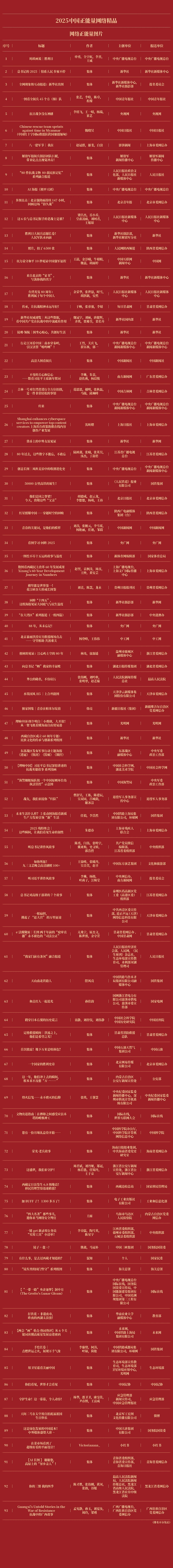 由中央网信办主办的2025中国正能量网络精品征集展播活动今天揭晓结果,经过大众评审、专家评议、评委线上打分和线下评审以及结果公示,50件十佳网络精品及500件网络精品脱颖而出,名单如下:
