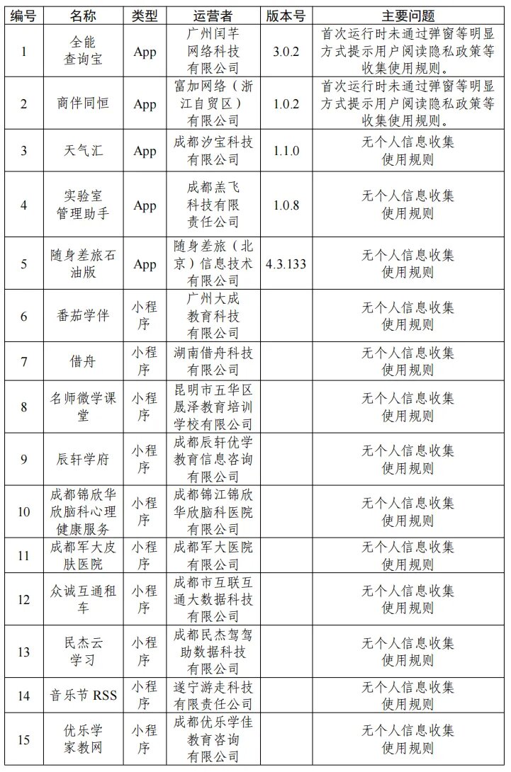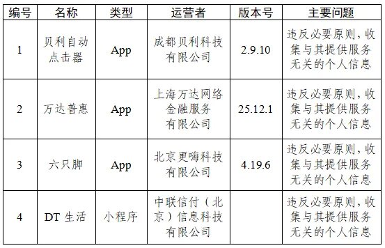 根据中央网信办、工业和信息化部、公安部联合发布的《关于开展2026年个人信息保护系列专项行动的公告》,依据《网络安全法》《个人信息保护法》《网络数据安全管理条例》《App违法违规收集使用个人信息行为认定方法》等法律法规和有关规定,中央网信办组织对App(含小程序)收集使用个人信息行为进行检测,现对有关问题予以通报: